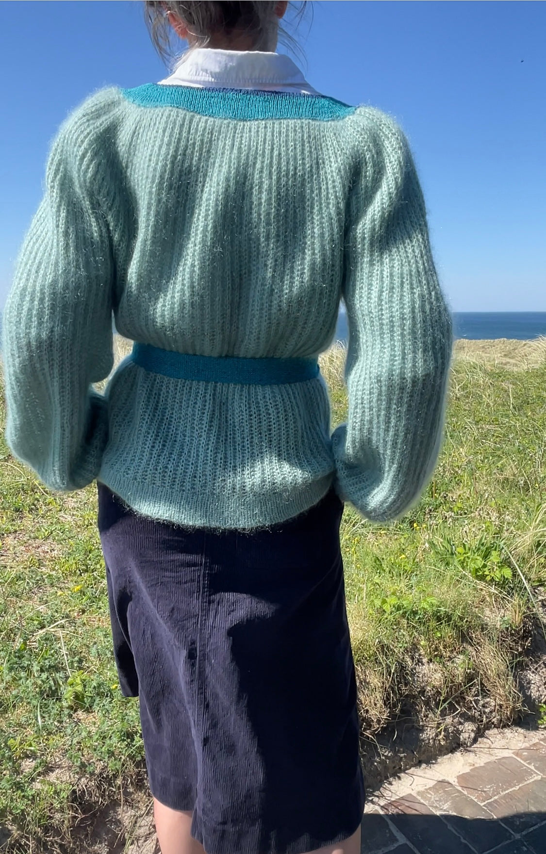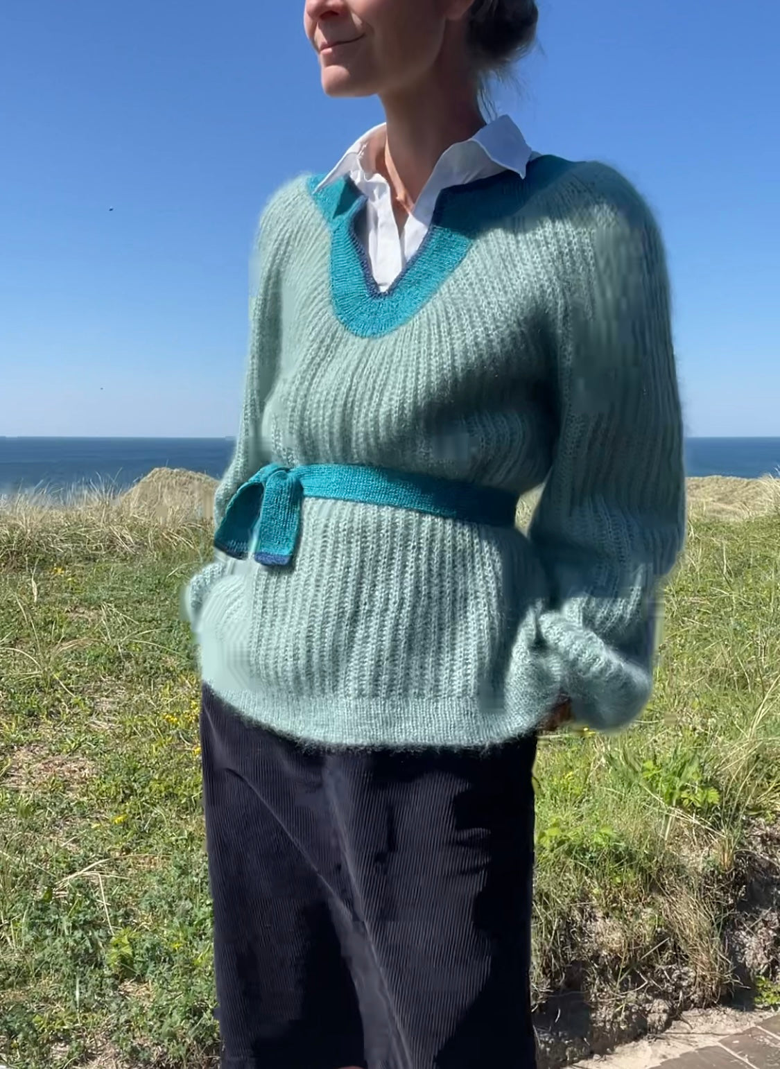Gode idéer opstår ofte, fordi man på en eller anden måde er blevet inspireret af noget, man har set en gang. Denne opskrift tager afsæt i en trøje, som en veninde, jeg i sin tid gik i gymnasiet med, fik lov at købe i dyredomme af sine forældre. Den var anderledes og noget jeg ikke havde set før. Der var noget ekstravagant over den og den klædte hende virkelig godt. Jeg må indrømme efter mere end tyve år, er detaljerne i min hukommelse lidt rustne, men noget af snittet fra trøjen, som var lavet i stof, har jeg med i sweateren her. Jeg har leget meget med formgivning i denne sweater, som jeg troede skulle være tæt på en umulighed. Det endte med at blive en lang - men ukompliceret fødsel.